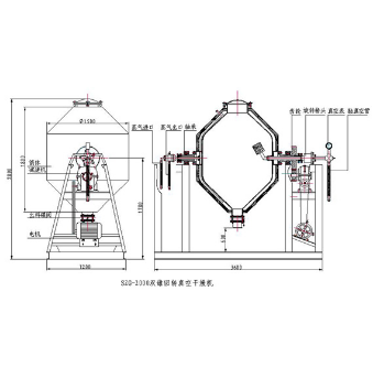 雙錐回轉真空干燥機為雙錐形的回轉罐體,罐內在真空狀態下,向夾套內通入蒸汽或熱水進行加熱,熱量通過罐體內壁與濕物料接觸。濕物料吸熱后蒸發的水汽。通過真空泵經真空排氣管被抽走。由于罐體內處于真空狀態,且罐體的回轉使物料不斷的上下,內外翻動,故加快了物料的干燥速度,提高干燥效率,達到均勻干燥的目的。