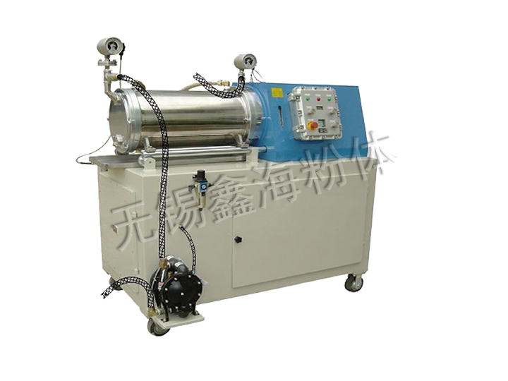 利用料泵將經過攪拌機預分散潤濕處理后的固-液相混合物料輸入筒體內,物料和筒體內的研磨介質一起被高速旋轉的分散器攪動,從而使物料中的固體微粒和研磨介質相互間產生強烈的碰撞、摩擦、剪切作用,達到加快磨細微粒和分散聚集的目的。研磨分散后的物料經過動態分離器分離研磨介質,從出料管流出。臥式砂磨機特別適合分散研磨粘度高且粒度要求細的產品。